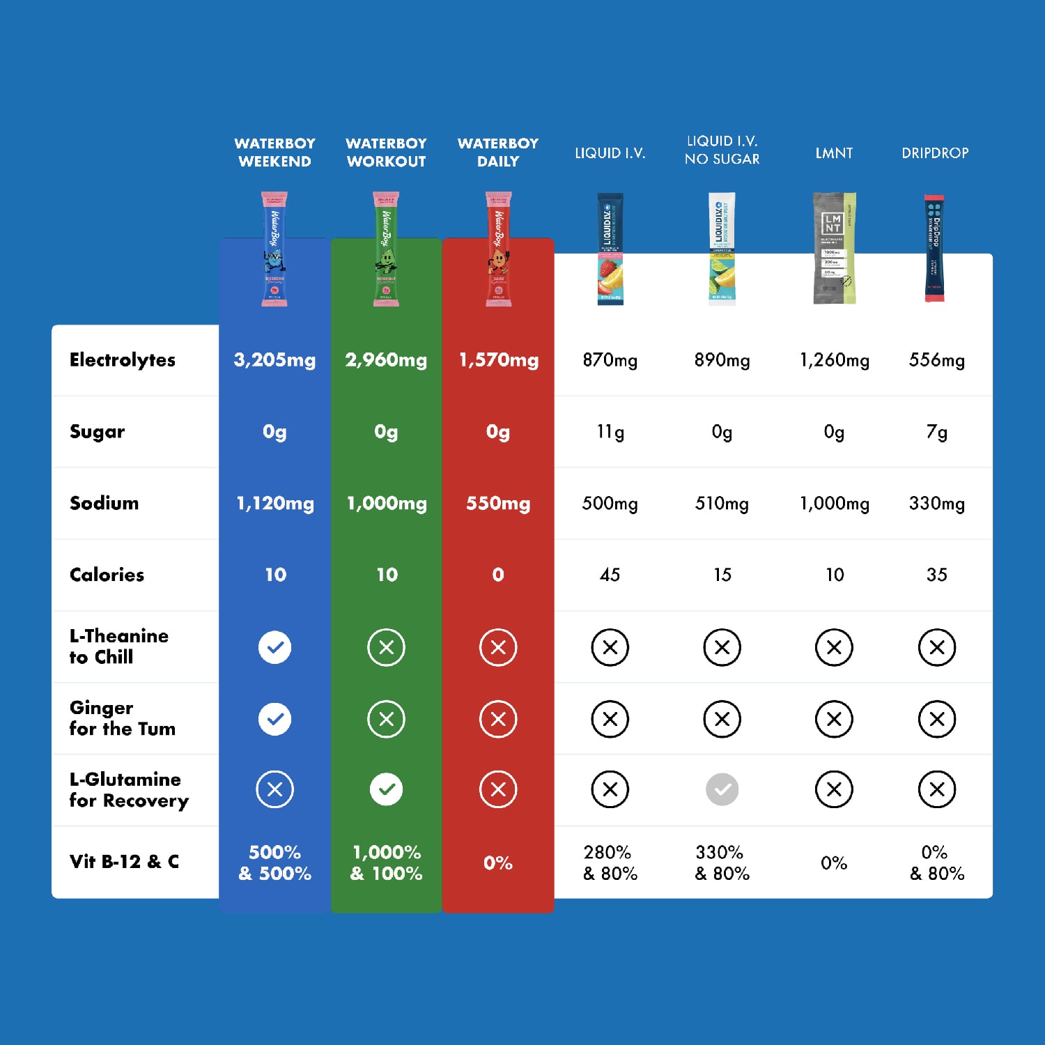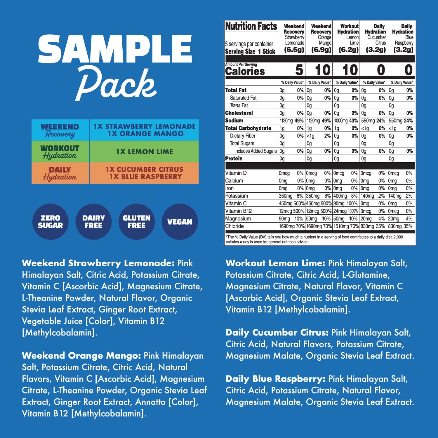 Weekend recovery: 9x electrolytes, 0 grams of sugar + weekend recovery blend.